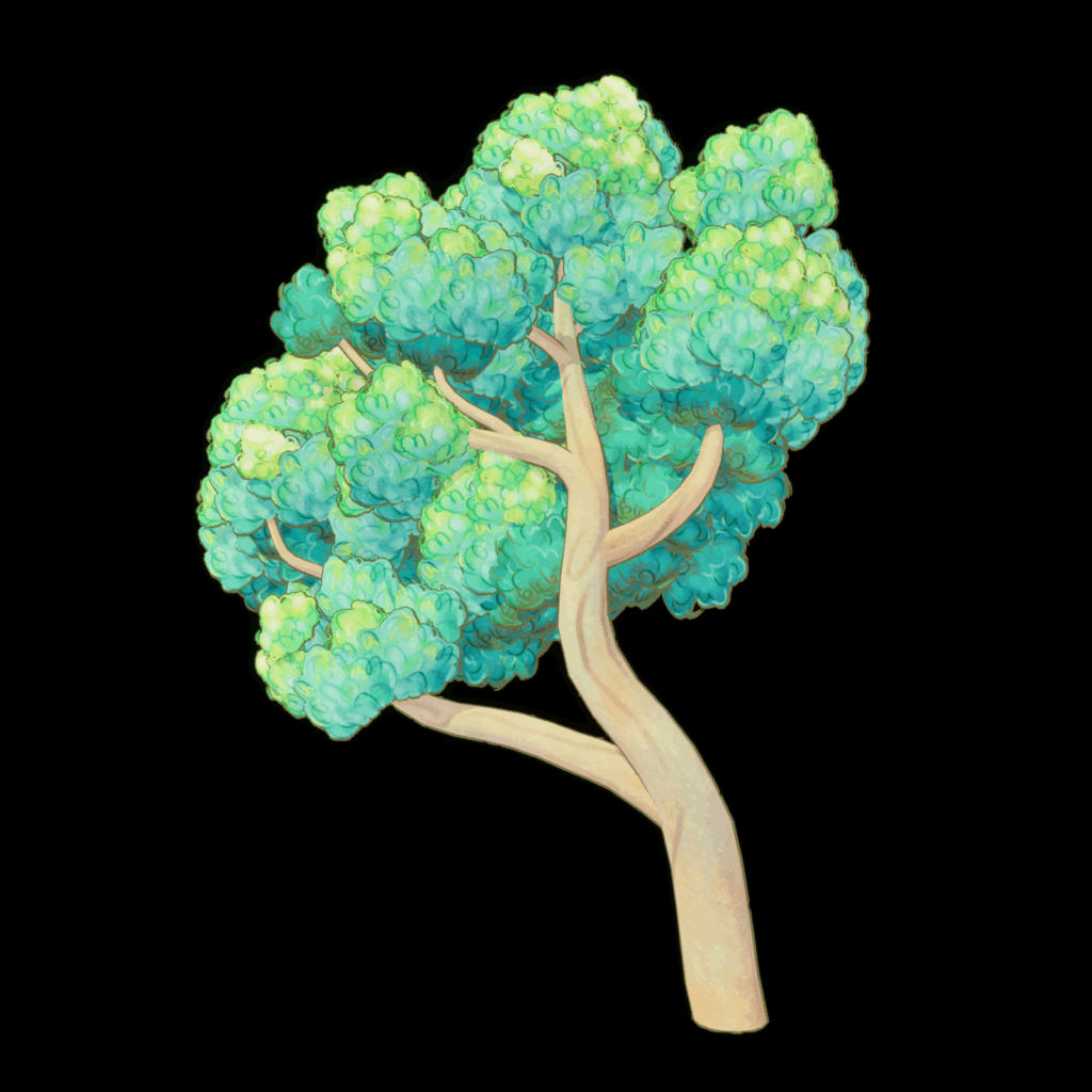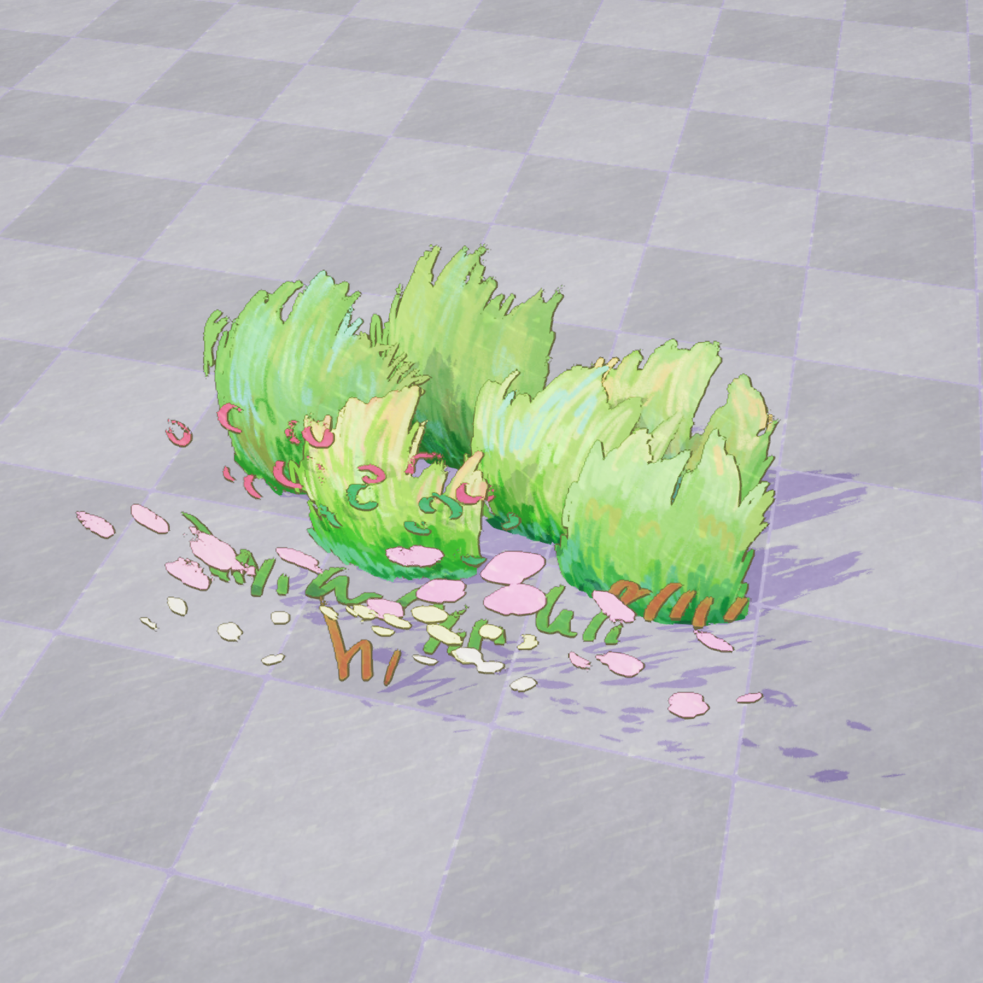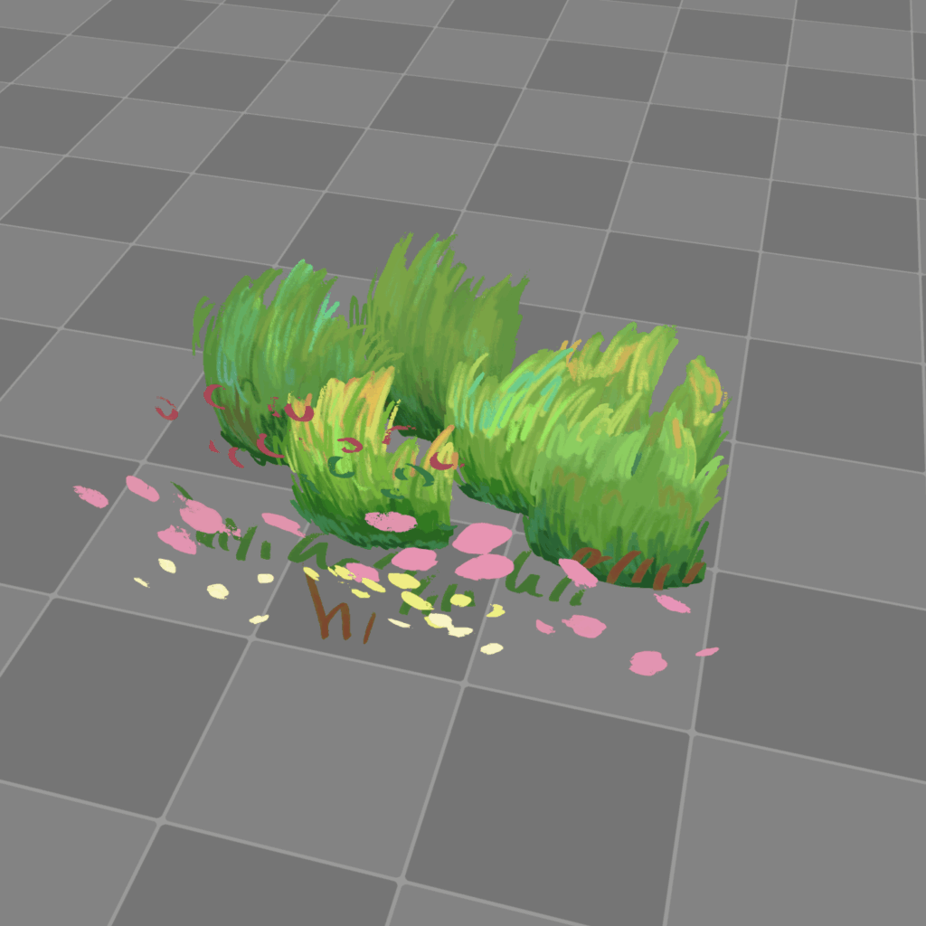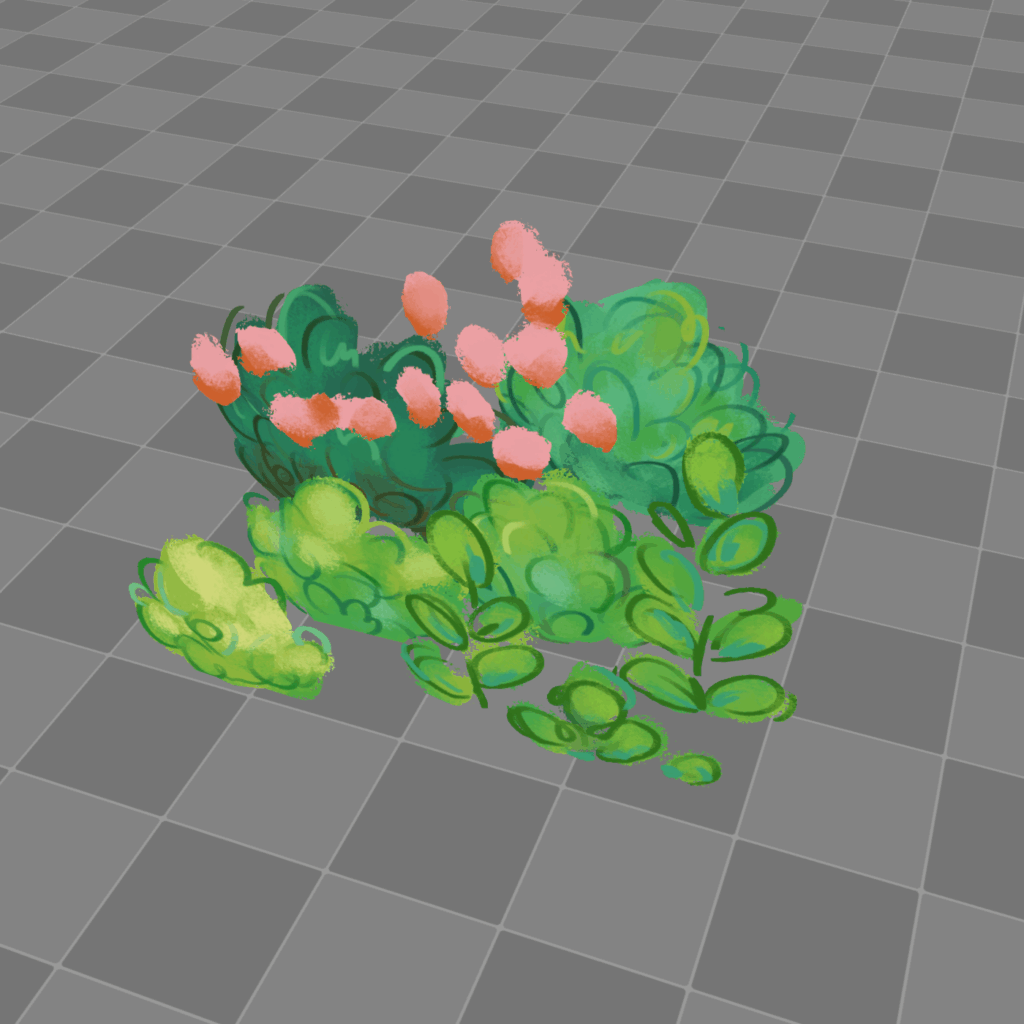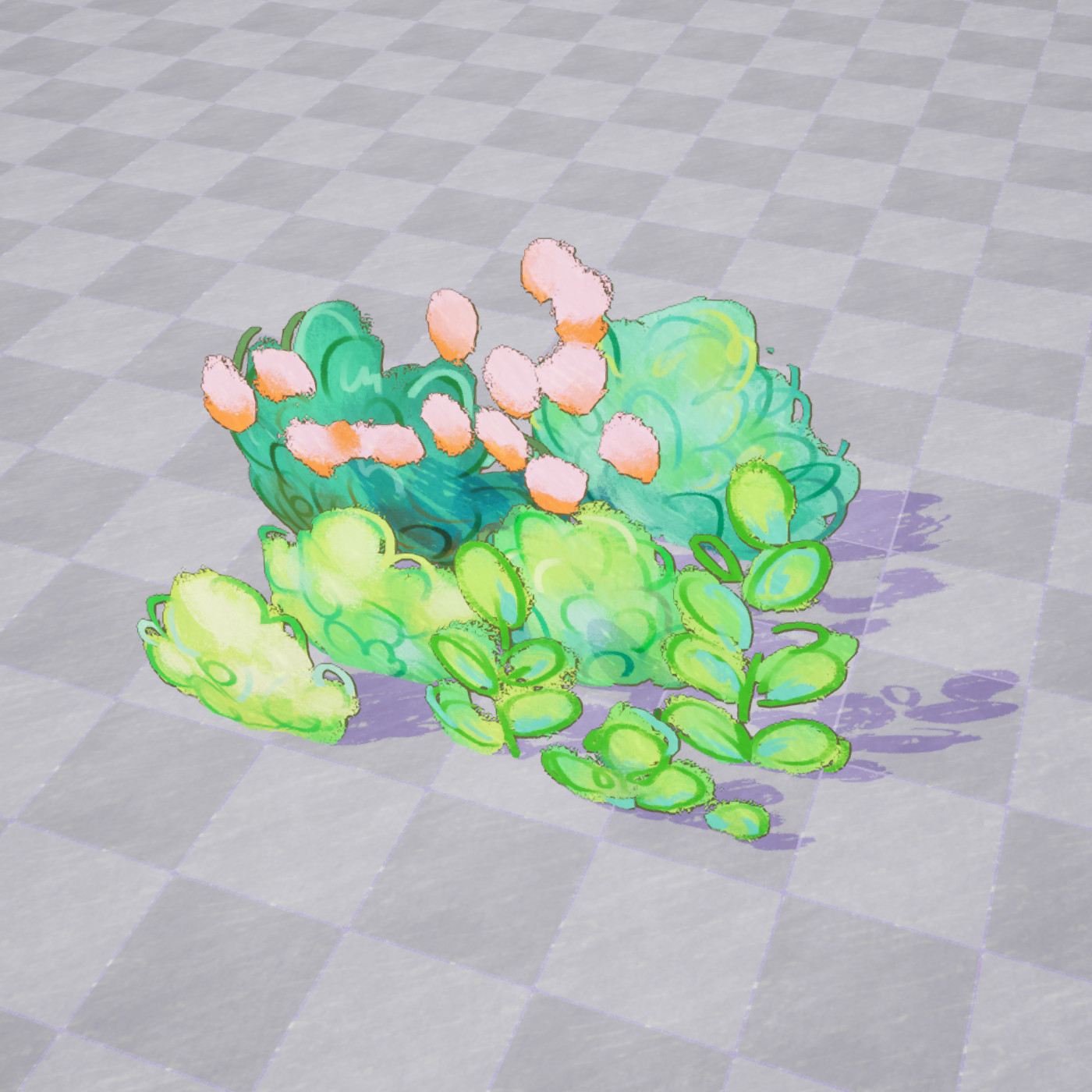 All plants and mushrooms were procedurally modeled and placed in Houdini. Bushes were created using the SideFX Labs Tree Generator, and the pink mushroom was created using a growth simulation. Particles and rendering also done in Houdini.